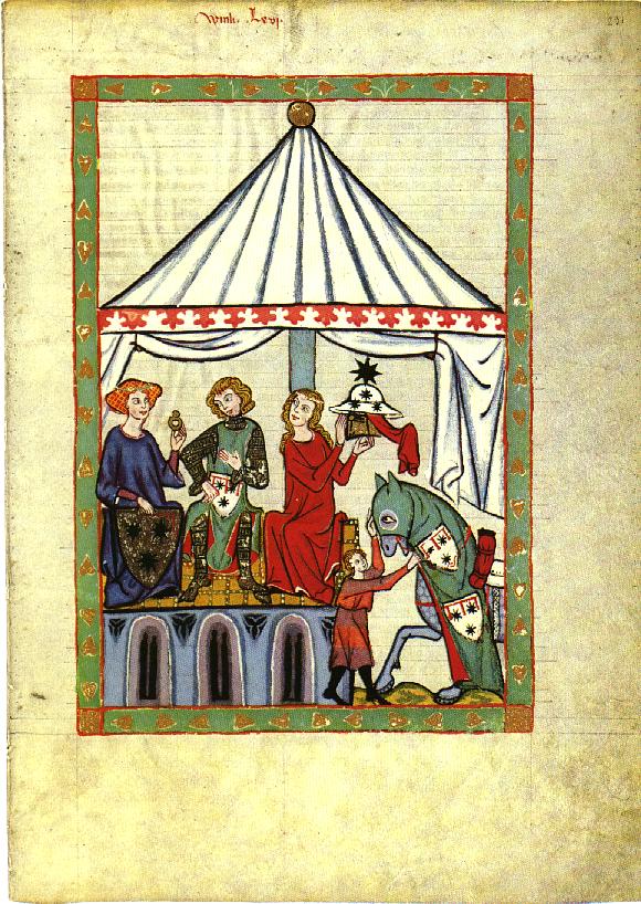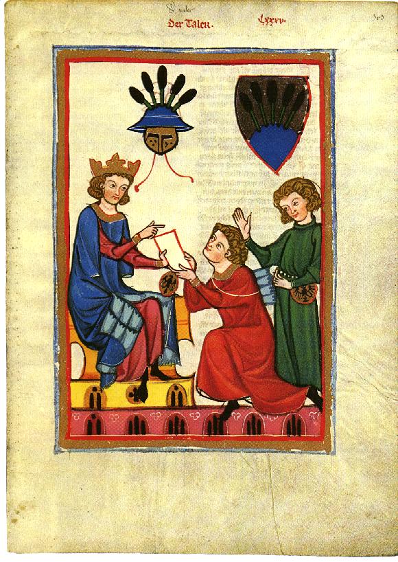 Each of the miniatures is labeled. Lots of folks with that pesky Herzog (Duke) title in front of their name seem to have golden helmets. The master illuminator could be trusted with expensive gold paint, so he made use of it, but there is ample evidence for the highest echelons displaying their weal...