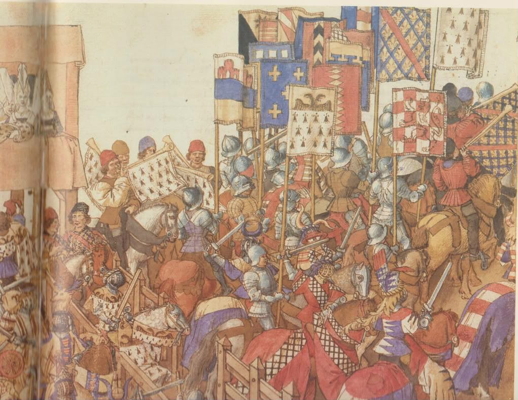 When on foot they sometimes wore a kettle helm that fit over the bascinet helm; especially in siege warfare and you’re the one standing below the walls getting shit dropped or shot down on you. You’d end up with a brimmed bascinet helm look.